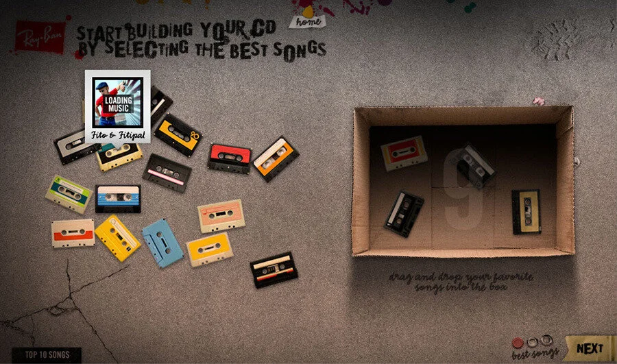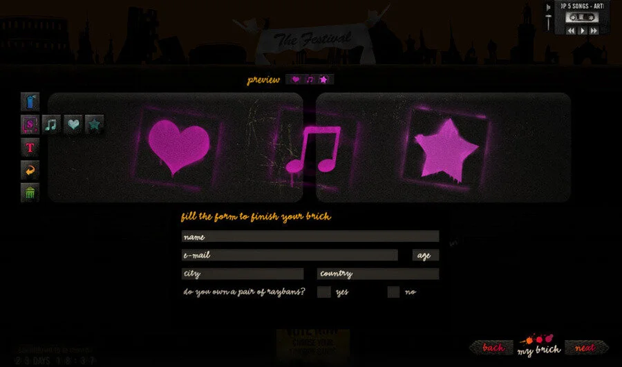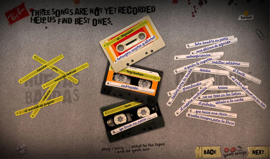 Each voter was given the opportunity to win free concert tickets and leave a metaphoric mark on the La Movida occasion by tagging their signature on a wall that overlooks iconic buildings in Spain. The bands and songs with the most votes were featured at Ray-Ban sponsored concerts and on a Warner Music produced CD. Both the CD playlist and a booklet art with the collection of tags from the wall of the webiste were created from the results of this online promotion.